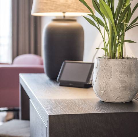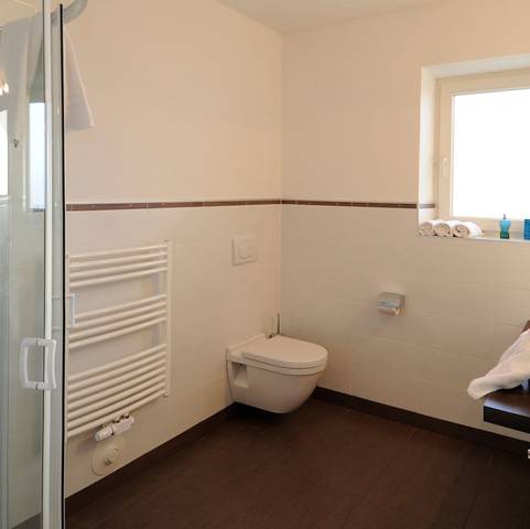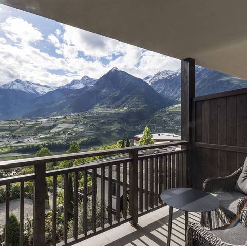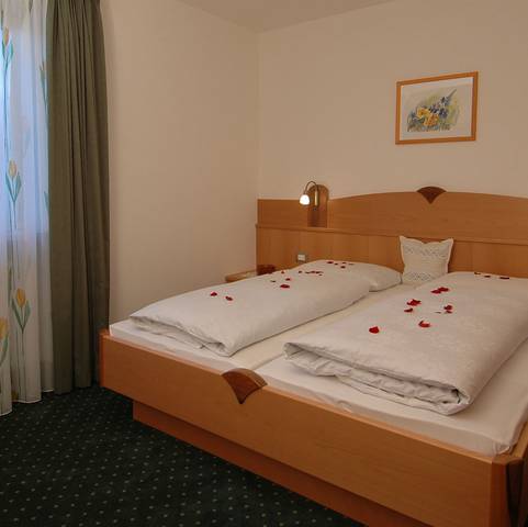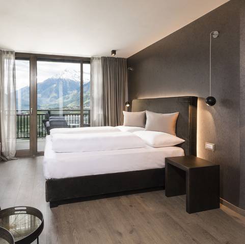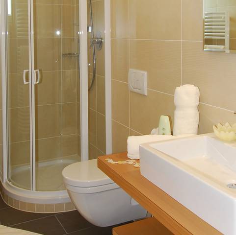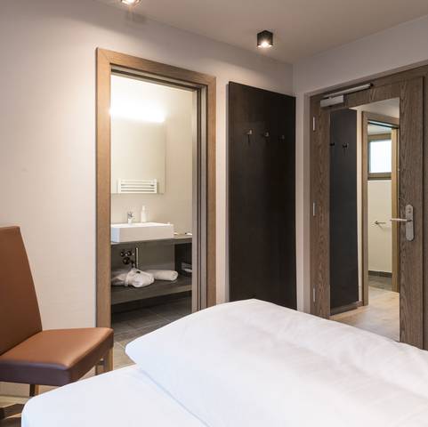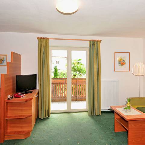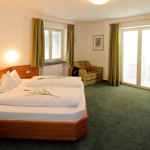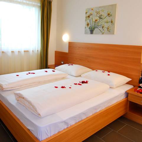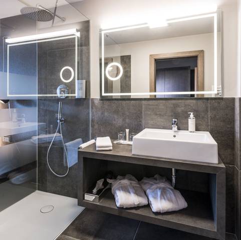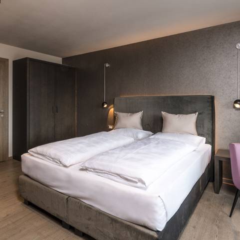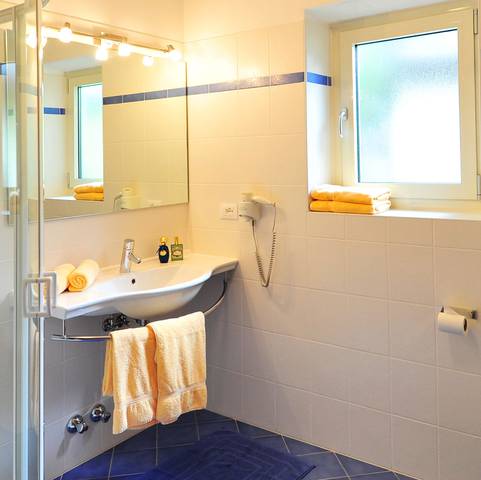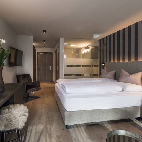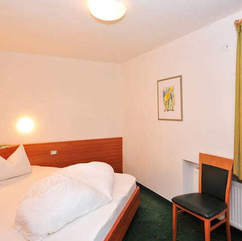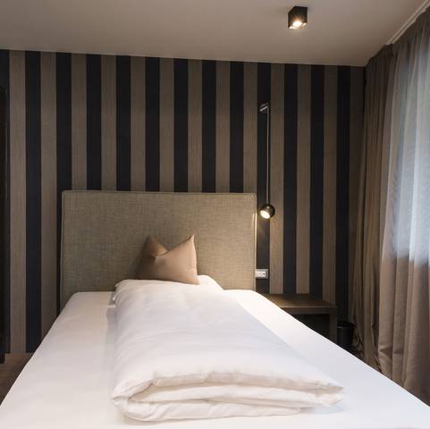 Ampia e luminosa camera singola con letto grande, TV satellitare, WiFi, cassaforte, telefono, minibar, bagno moderno con doccia, WC, asciugacapelli e borsa wellness con asciugamani, ciabattine e accappatoi, balcone a est.